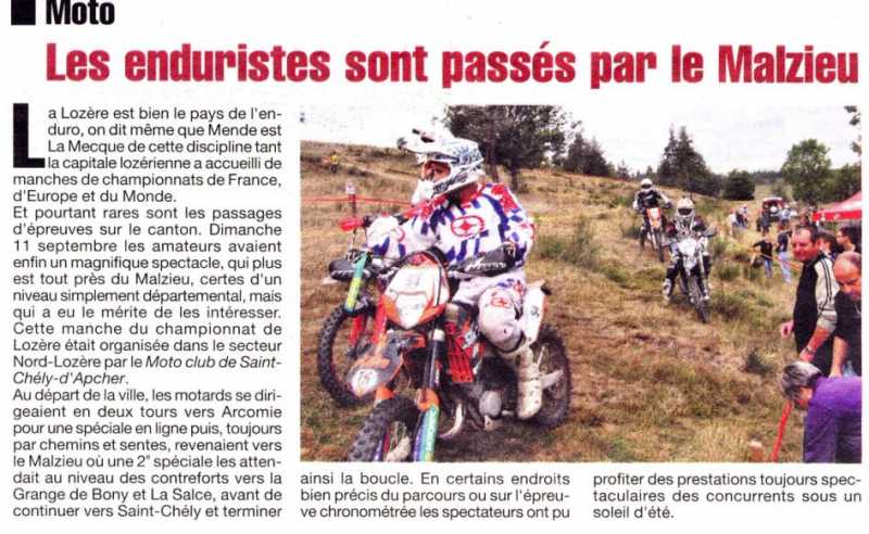 Le 5ème enduro de St Chély d’Apcher aura lieu les samedi 10 et dimanche 11 septembre 2011 sur les communes de St Chely d’Apcher, Les Mont Vert, Blavignac, Albaret sainte Marie, Chaulhac, St leger du Malzieu, Le Malzieu Ville , le Malzieu Forain, Lajo, Prunière, St Pierre le Vieux, St Alban sur Limagnole et Rimeize soit treize commune.
